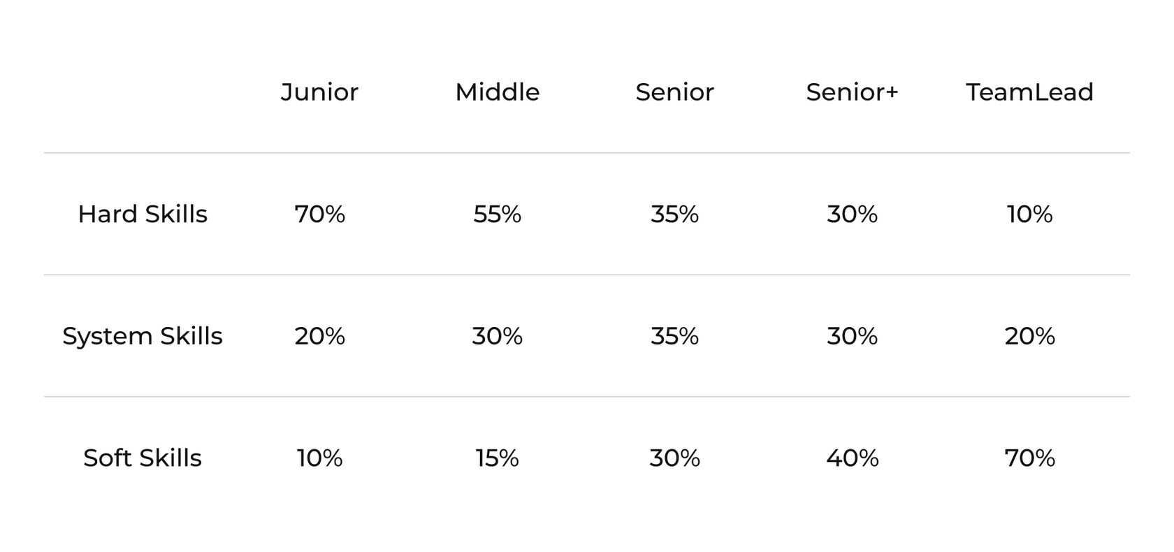 Чем ниже грейд, тем больше значимость хардов и ниже софтов. Примерное распределение вы можете увидеть на картинке.